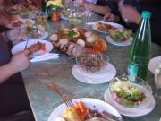 V osrednjem delu vsakega turnirskega dne je kosilo seveda še kako zaželjeno, po štirih partijah pa tudi potrebno. Oskar je letos udeležence popeljal na kmečki turizem Bajc, nedaleč od prizorišča, jasno, z obveznim lepim razgledom na okoliške kraje. Sobota je bila pri Bajčevih ravno čas trgatve, a so ob vsem delu imeli čas še za goste. Da so zbrano križemkražemsko družbo razvajali vse od juhe do popoldanske gibanice, priča priložena fotografija. Oskarjeve šale, s katerimi vselej še nekoliko dvigne sproščeno vzdušje, pa tudi niso manjkale. Celo nalezljive so bile.
